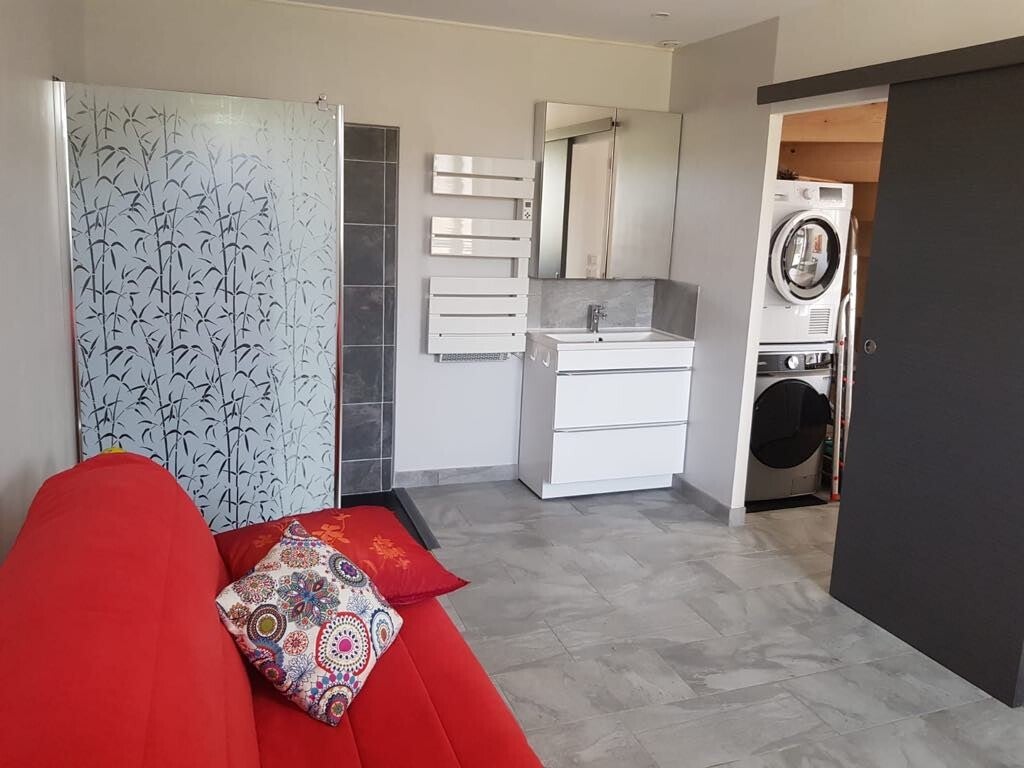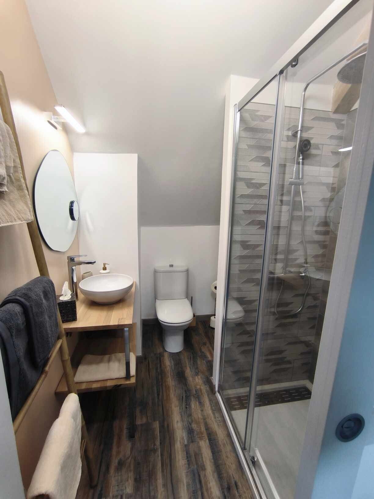 - Une chambre avec un canapé convertible de 160cm, d'une douche et meuble vasque.